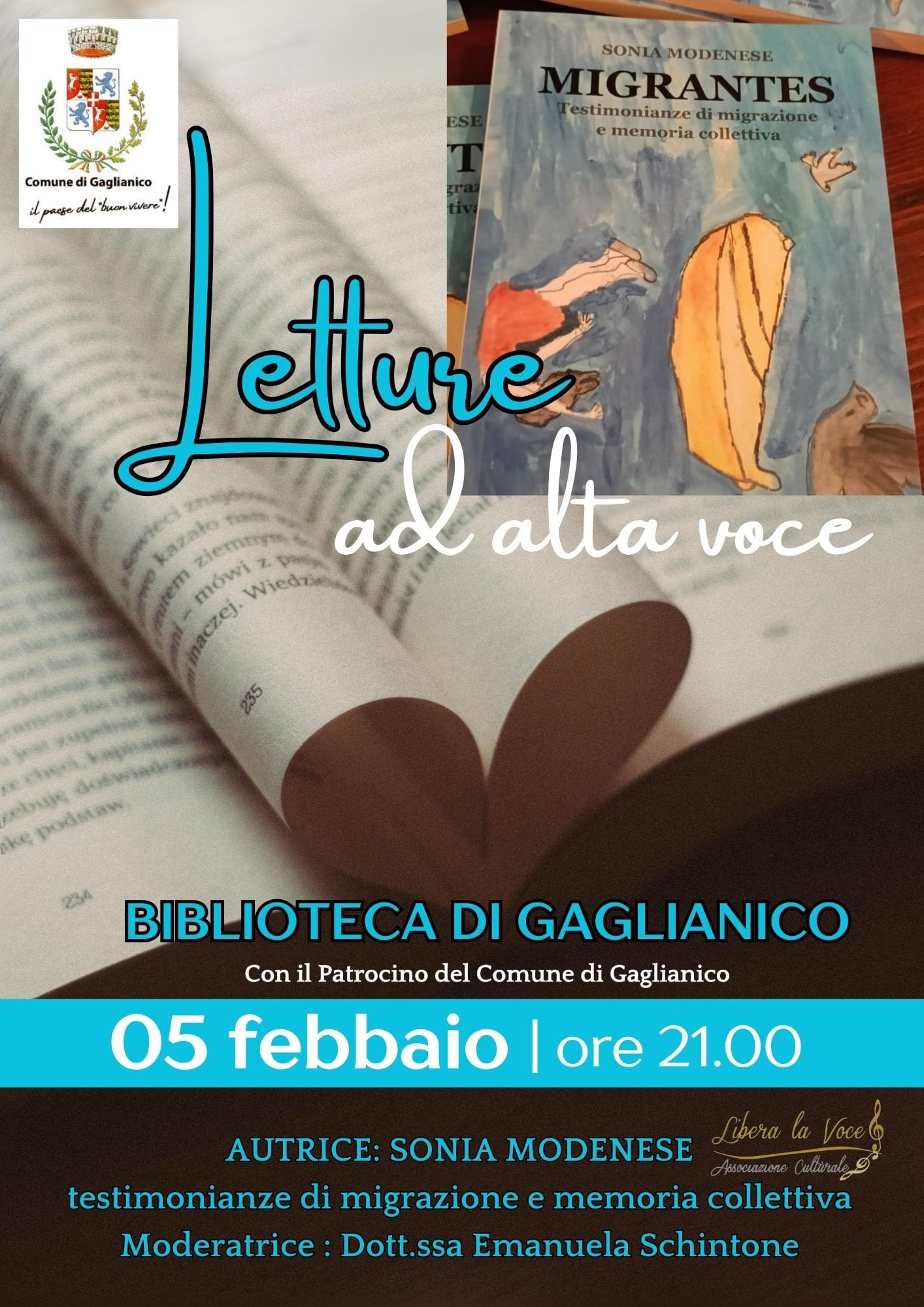 Il 5 febbraio 2026 alle ore 21:00 presso la Biblioteca Comunale di Gaglianico, l'Associazione Culturale Libera la Voce con il patrocinio del Comune di Gaglianico, organizza un secondo appuntamento di "letture ad alta voce".