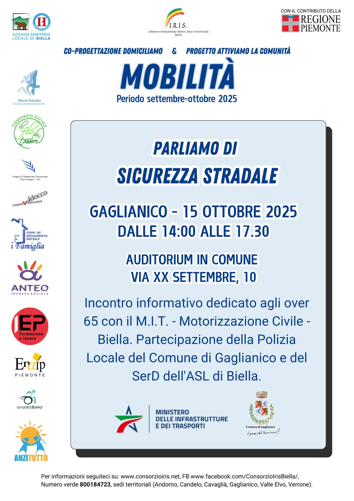 Mercoledì 15 ottobre dalle ore 14:00 alle ore 17:30 si terrà in Auditorium l'incontro formativo dedicato agli over 65 con il M.I.T. - Motorizzazione Civile - Biella. Partecipazione della Polizia Locale del Comune di Gaglianico e del SerD dell'ASL di Biella.
