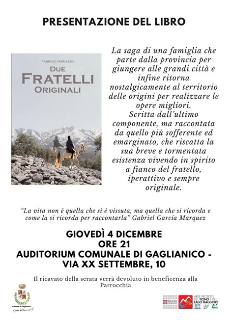 Giovedì 4 dicembre 2025 alle ore 21:00 presso l’Auditorium Comunale si terrà la presentazione del libro “Due fratelli originali”, la saga di una famiglia che parte dalla provincia per giungere alle grandi città e infine ritorna nostalgicamente al territorio delle origini per realizzare le opere migliori.