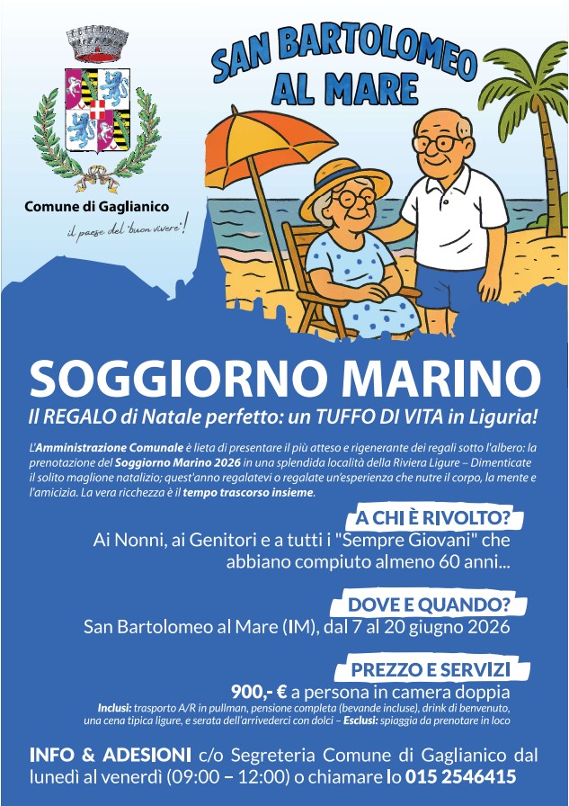 L'Amministrazione Comunale è lieta di presentare il più atteso e rigenerante dei regali sotto l'albero: la prenotazione del Soggiorno Marino 2026 in una splendida località della Riviera Ligure - Dimenticate il solito maglione natalizio; quest'anno regalatevi o regalate un'esperienza che nutre il corpo, la mente e l'amicizia. La vera ricchezza è il tempo trascorso insieme.