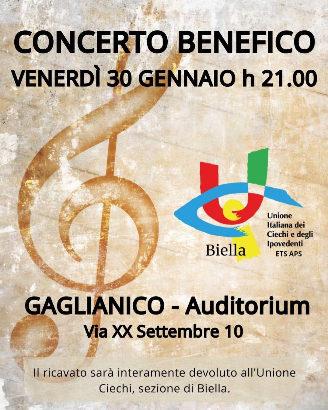 Venerdì 30 gennaio alle ore 21, presso l’Auditorium di Gaglianico, si terrà un concerto benefico a favore dell’Unione Italiana dei Ciechi e degli Ipovedenti – Sezione di Biella.