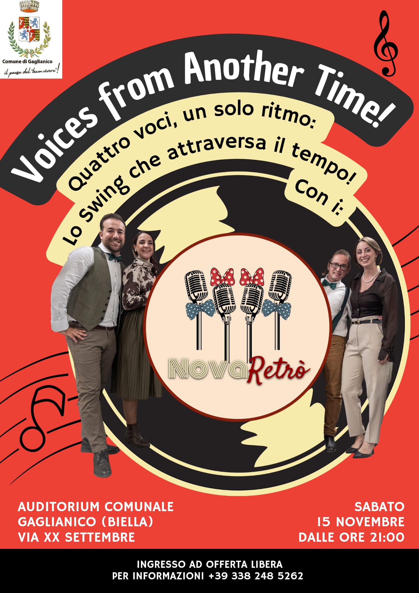 Sabato 15 novembre alle ore 21:00 presso l'Auditorium Comunale si terrà lo spettacolo musicale "Voices from Another Time! Quattro voci, un solo ritmo: Lo swing che attraversa il tempo con i NovaRetrò".