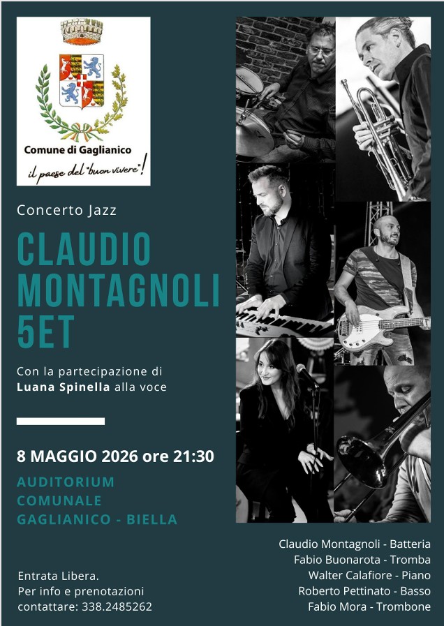 Venerdì 8 maggio alle ore 21:30 presso l'Auditorium Comunale si terrà il concerto jazz - Claudio Montagnoli 5 ET con la partecipazione di Luana Spinella alla voce