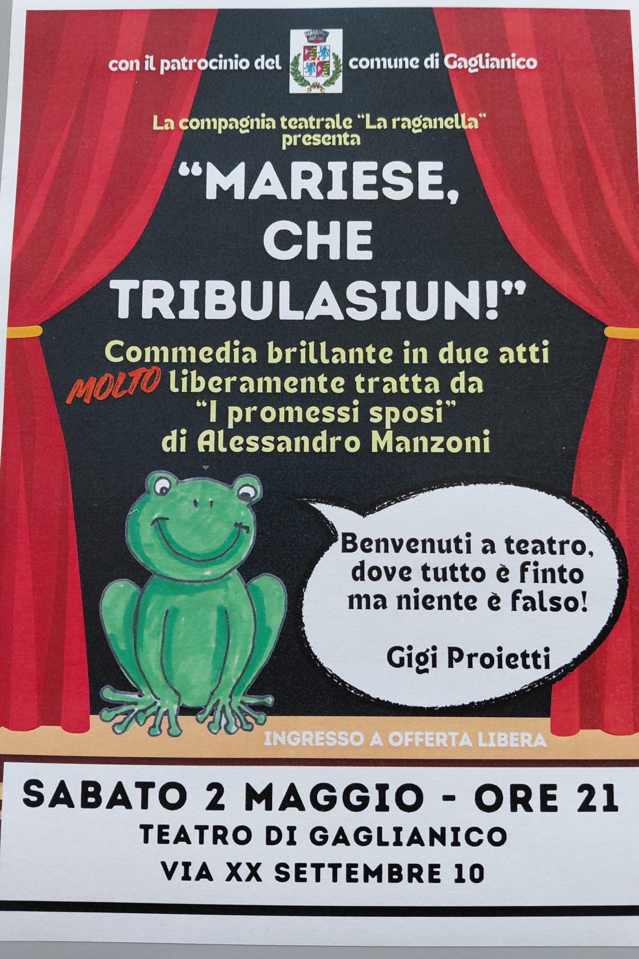 Sabato 2 maggio alle ore 21:00 presso l'Auditorium Comunale la Compagnia teatrale "La raganella", con il patrocinio del Comune di Gaglianico, presenta "Mariese, che tribulasiun!"